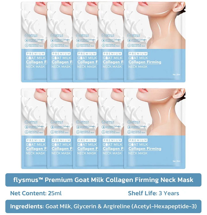 The flysmus™ Premium Goat Milk Collagen Firming Neck Mask is a specially formulated skincare product that is designed to tighten and firm the skin in the neck area. The mask contains a blend of natural ingredients, including goat milk, collagen, and peptides, that work together to nourish and rejuvenate the skin while promoting cell renewal and collagen production.